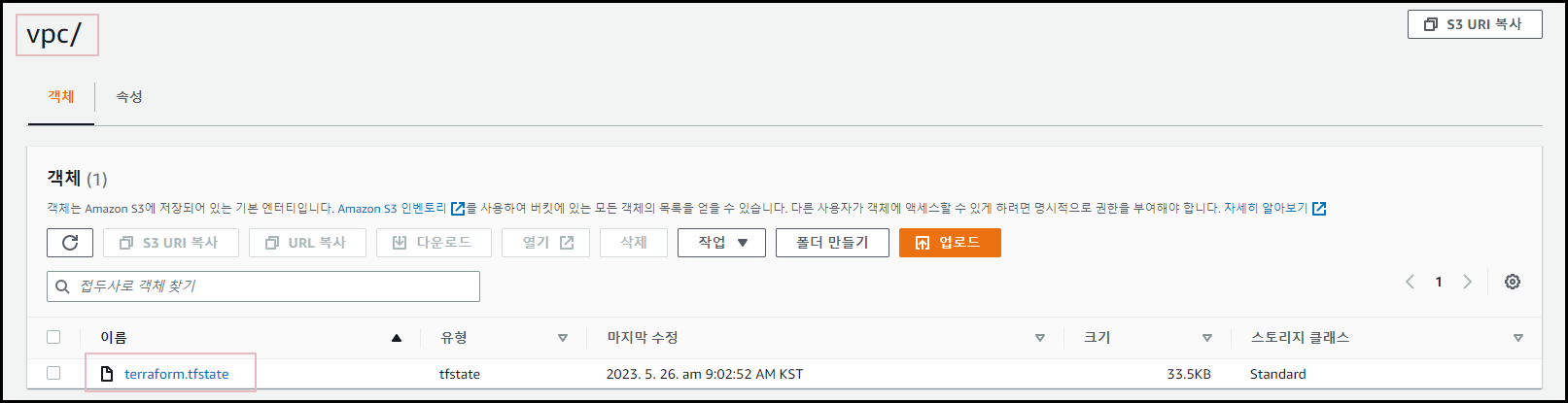 S3 내에 vpc 폴더가 생성되며 상태파일이 저장되는 모습을 확인할 수 있습니다 !.