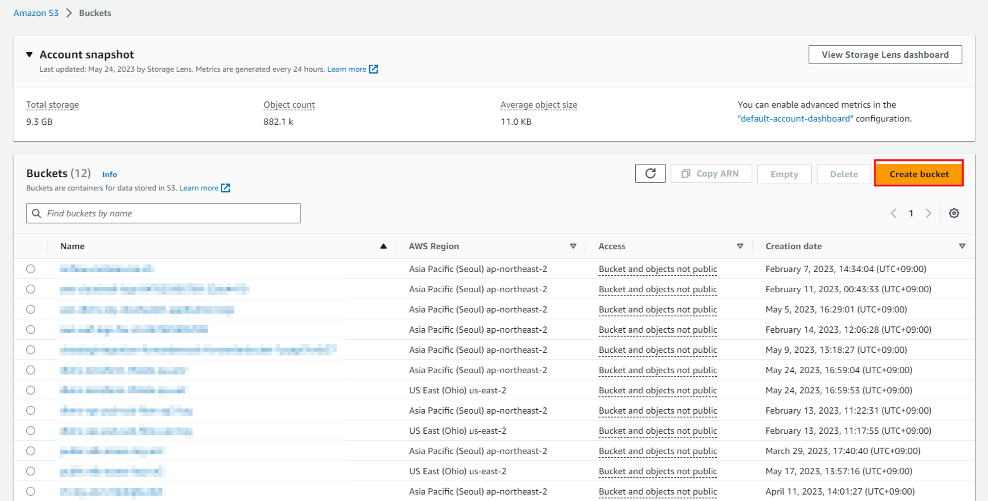 Create Bucket를 하여 버킷을 생성합니다. 버킷 이름은 고유한 값을 가져야 하고 중복될 수 없는 것 아시죠?