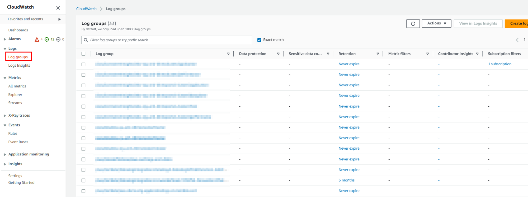 클라우드 워치로 들어가 s3에 저장하고 싶은 로그 그룹을 확인합니다.