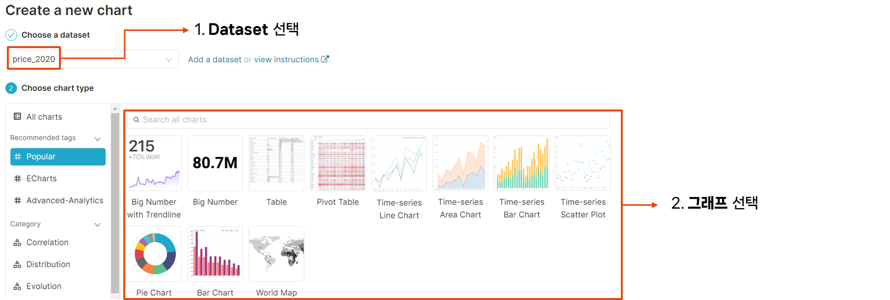 Superset에서 차트를 그리기 위해선 3가지 절차가 있습니다.