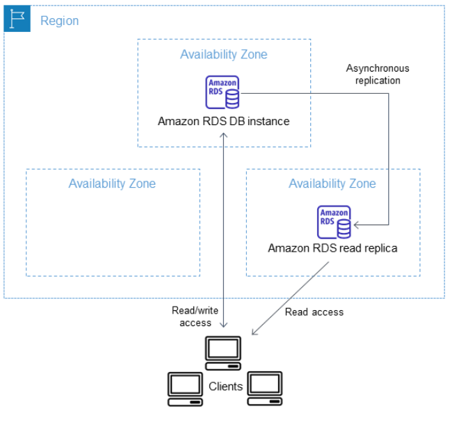 MySQL, MariaDB, PostgreSQL, Oracle 및 SQL Server 데이터베이스 엔진의 경우, Amazon RDS에서 소스 DB 인스턴스의 스냅샷을 사용해 두 번째 DB 인스턴스를 생성합니다. 그런 다음 엔진의 기본 비동기식 복제 방법을 사용해 소스 DB 인스턴스가 변경될 때마다 읽기 전용 복제본을 업데이트합니다.