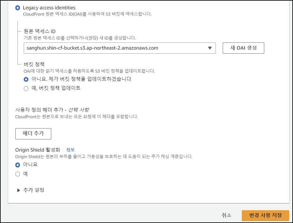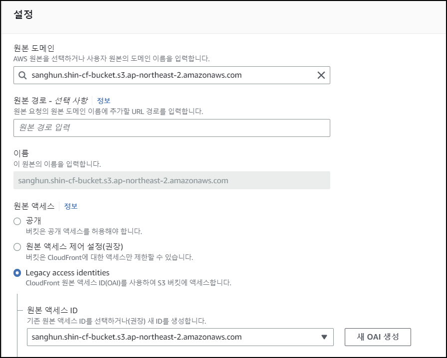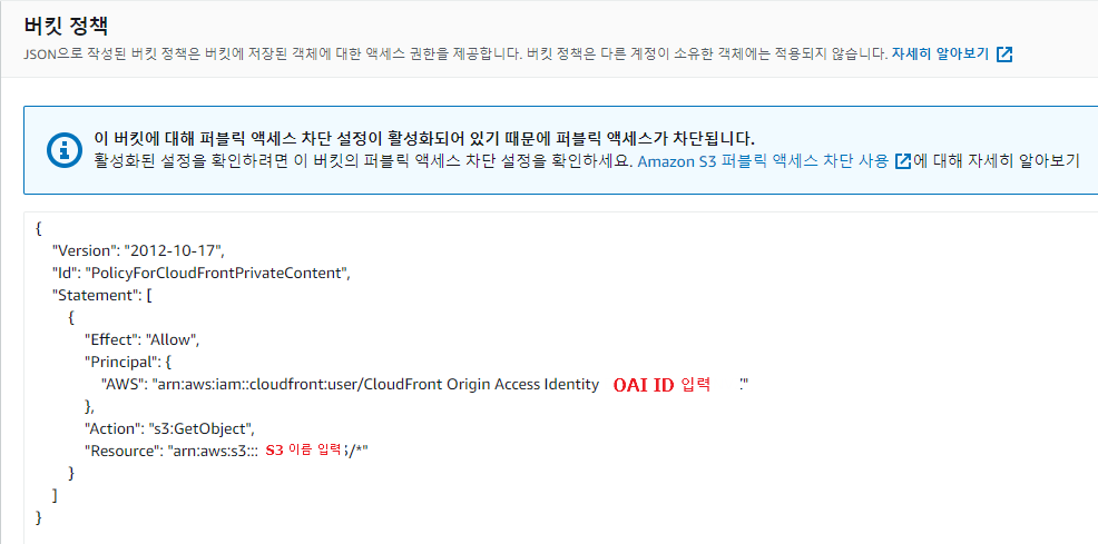 - S3 퍼블릭 엑세스 비활성화 시 아래 이미지처럼 OAI사용하여 S3에 권한 연결