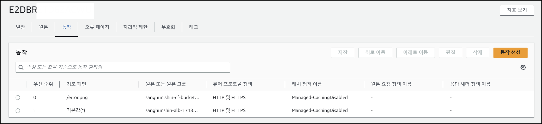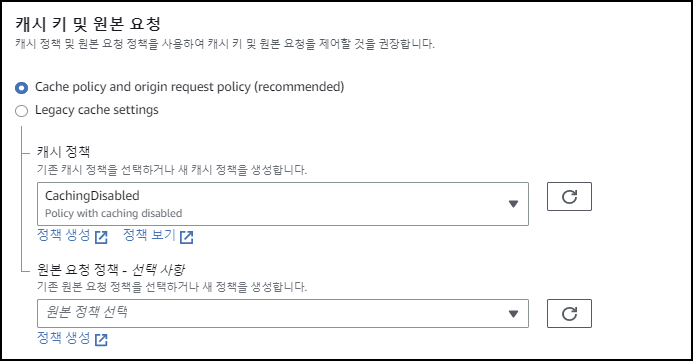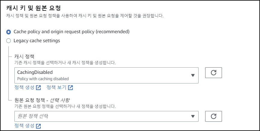 2. 캐시정책같은 경우는 Disabled로 설정해줍니다(캐싱처리를 하게 되면 alb 로드밸런싱 테스트 및 systemctl stop httpd.service를 했을 경우 서비스중단 페이지(/error.png)로 전환이 불가