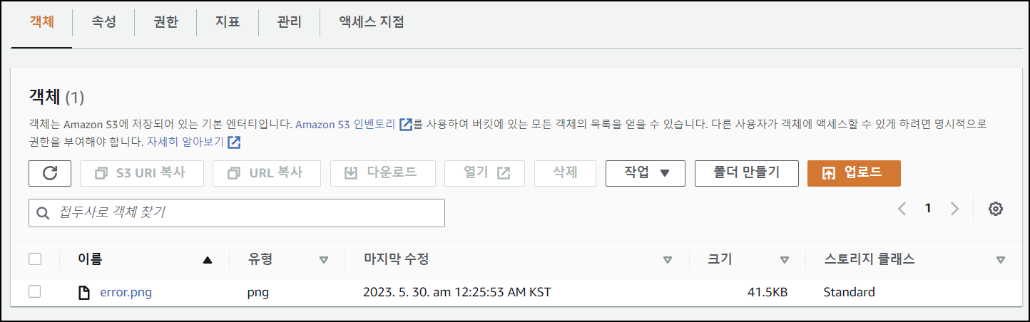 - AWS CloudFront와 S3 버킷 간의 프라이빗 콘텐츠를 허용하기 위한 정책 생성 후 에러 페이지로 전환할 객체(error.png) 업로드
