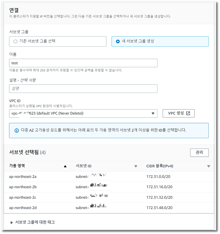 서브넷 그룹을 생성하고 VPC 가용영역을 선택한 후에 생성 버튼을 눌러보아요~