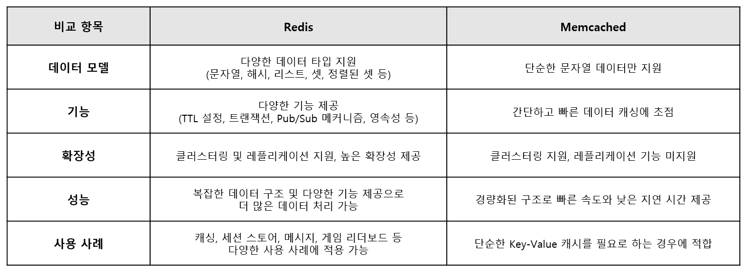 위와 같이 Redis와 Memcached의 차이점이 있어요!