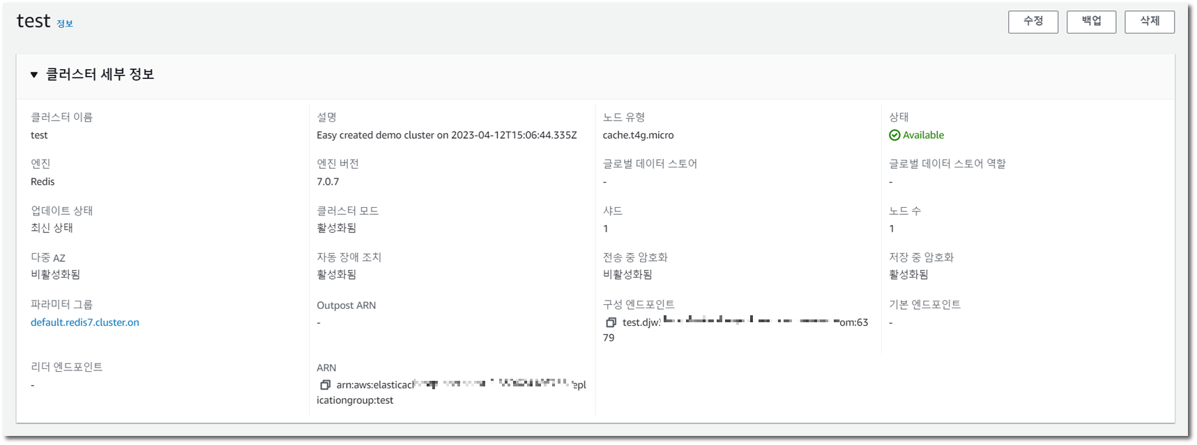 생성한 뒤에 엔드포인트를 메모해둡시다!! ㅎㅎㅎ