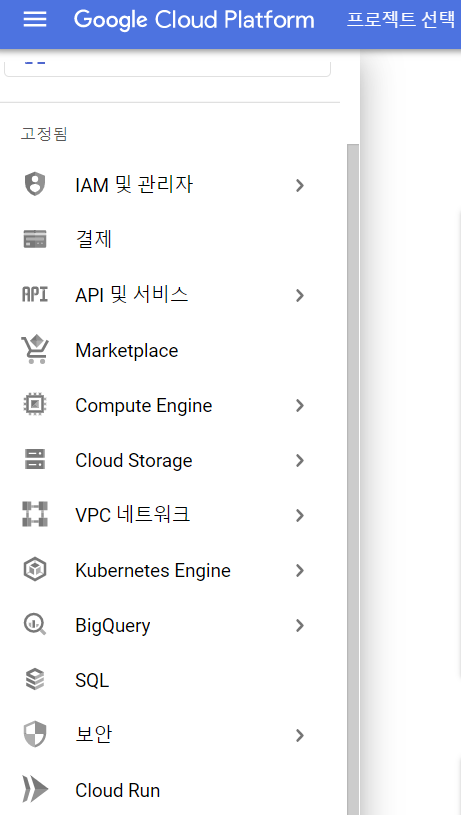 이렇게 접속하여 앞 서 설명드렸던 다양한 GCP의 제품들을 간단하게 관리할 수 있습니다.