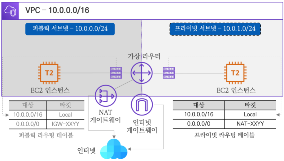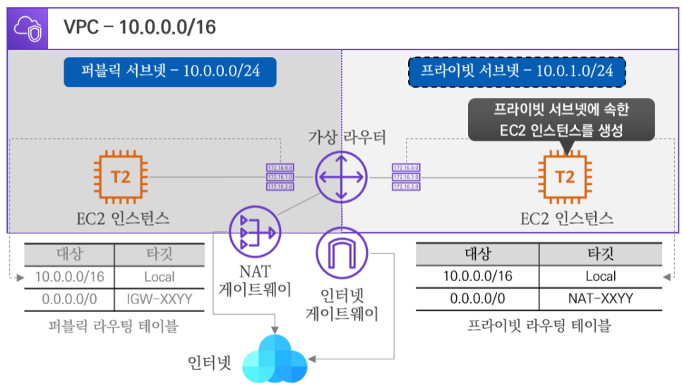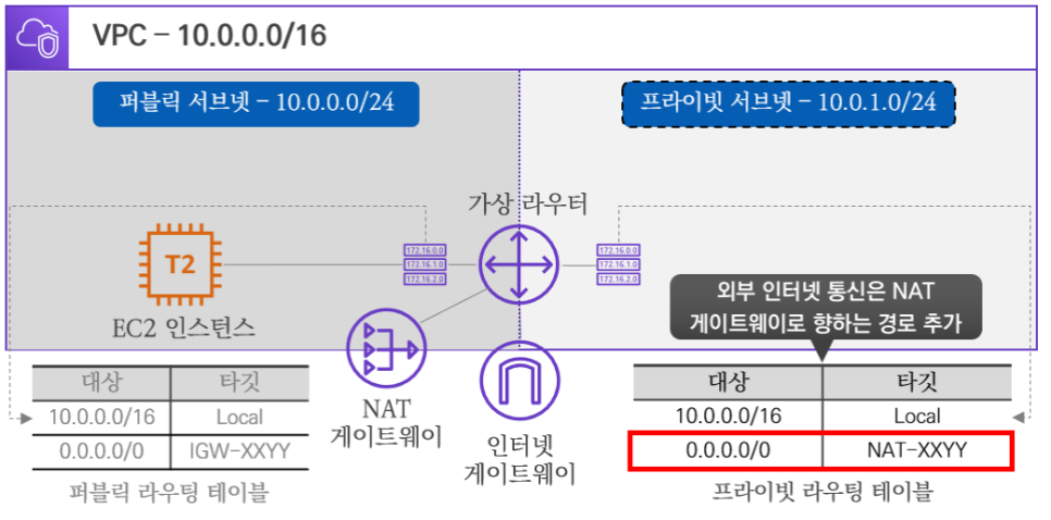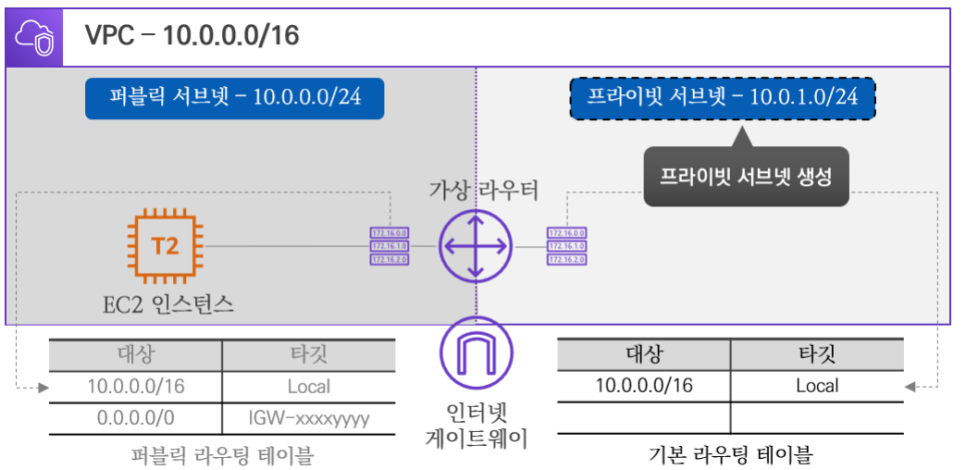 단일 퍼블릭 서브넷 VPC에 이어서 프라이빗 서브넷을 생성하여 외부 인터넷 구간과 통신되는 과정을 확인합니다.
