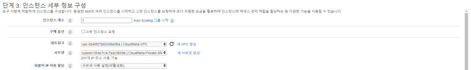 네트워크 : 생성한 VPC, 서브넷 : 생성한프라이빗 서브넷으로 설정하고 나머지는 모두 기본 값으로 설정합니다.