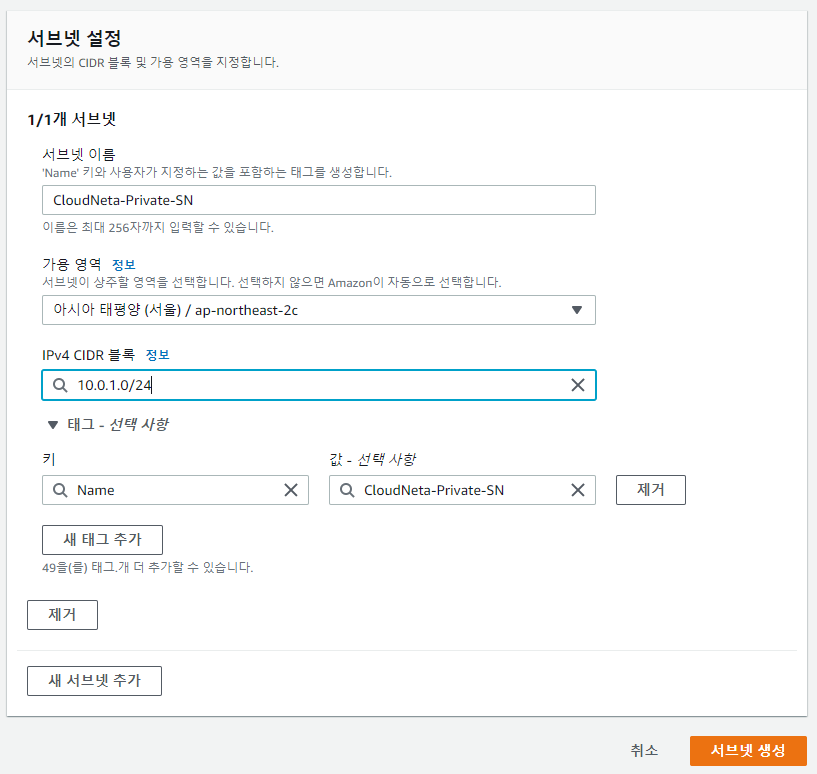 -> 생성한 VPC를 선택하고 위와 같이 설정후 서브넷 생성 버튼을 클릭합니다.