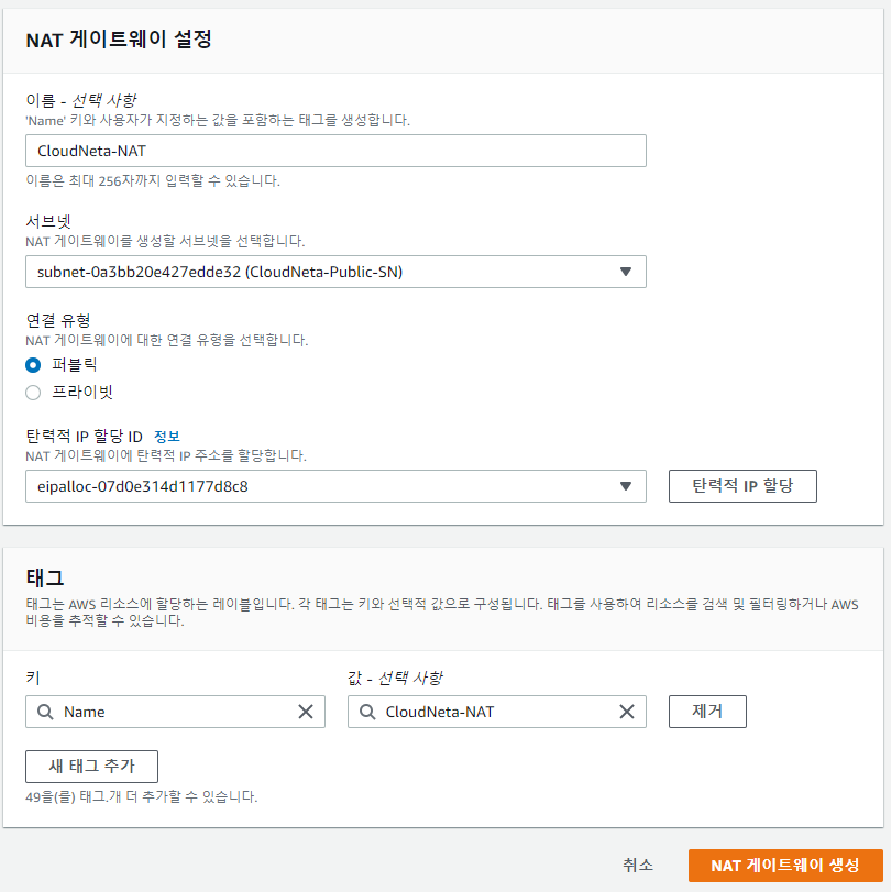 -> 이름과 서브넷을 퍼블릭 서브넷으로 지정하고 탄력적 IP 할당을 받고 태그를 추가하여 NAT 게이트웨이 생성 버튼을 클릭합니다.