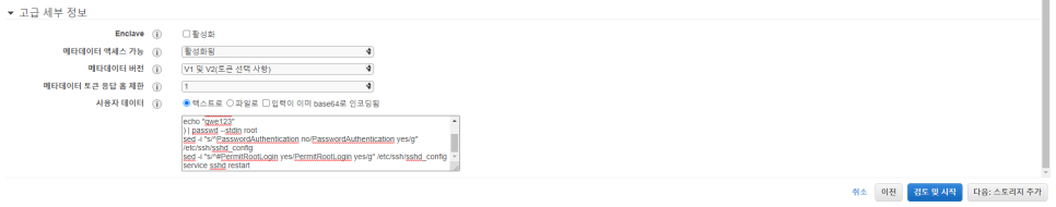 -> 그리고나서 단계 3: 인스턴스 세부 정보 구성 제일 밑으로 가면 고급 세부 정보에서 다음과 같이 설정합니다.