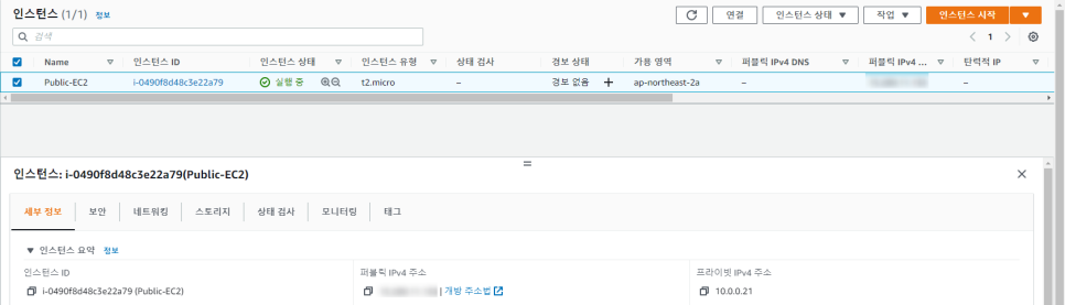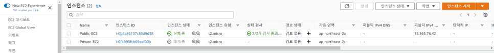 -> EC2의 퍼블릭 IP 주소와 프라이빗 EC2 인스턴스의 프라이빗 IP 주소를 확인해 줍니다.