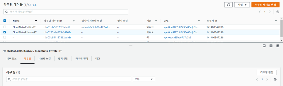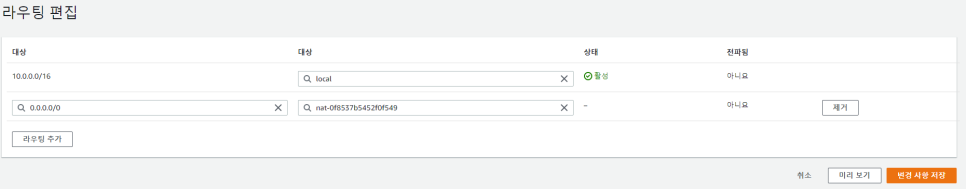 -> 프라이빗 라우팅 테이블을 선택하고 라우팅에 접근 후 라우팅 편집 버튼을 클릭합니다.