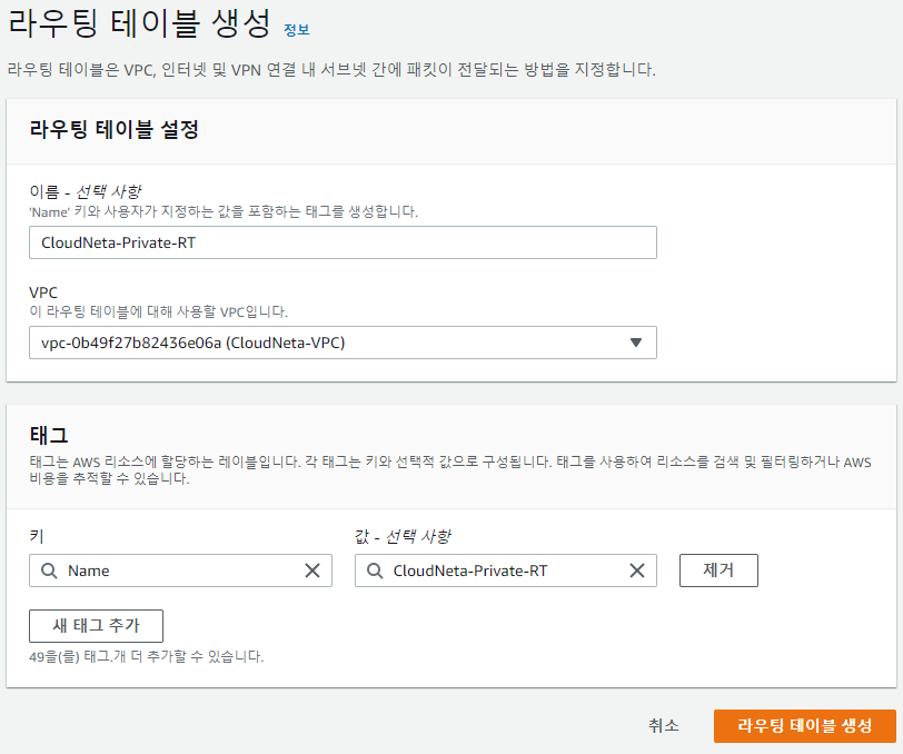 -> 이름을 입력하고 생성한 VPC를 선택 후 라우팅 테이블 생성 버튼을 클릭합니다.