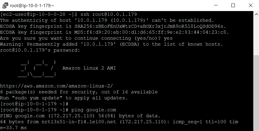 -> 프라이빗 서브넷 내에 존재하는 프라이빗 EC2 인스턴스가 NAT 게이트웨이를 통해 외부 인터넷과 정상적으로 통신이 가능한 모습입니다.