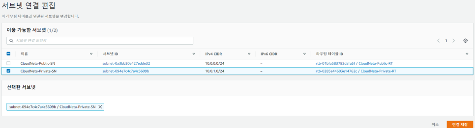-> 생성한 프라이빗 서브넷을 라우팅 테이블에 연결해주고 연결 저장 버튼을 클릭합니다.