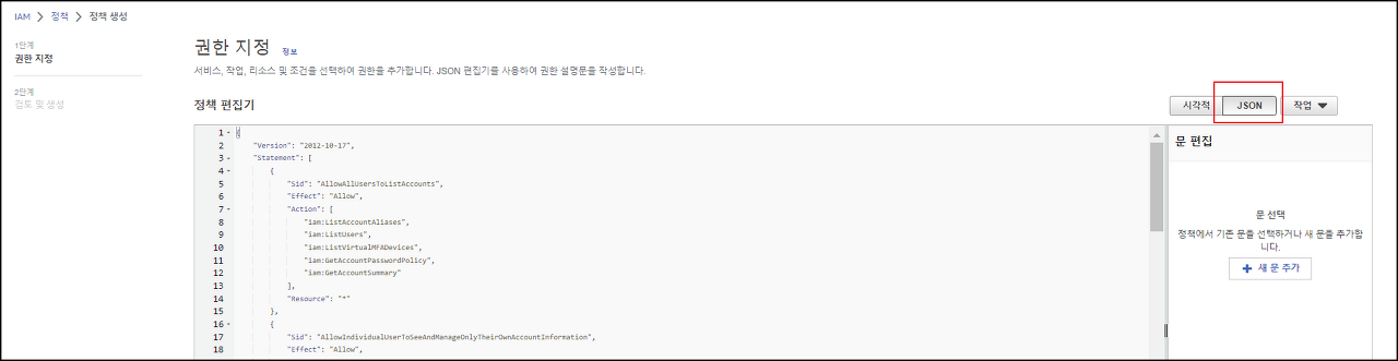 IAM -> 정책 -> 정책생성에서 정책편집기 JSON을 선택하여 정책 내용(MFA-Policy.txt)을 붙여넣은 후 정책을 생성해줍니다.