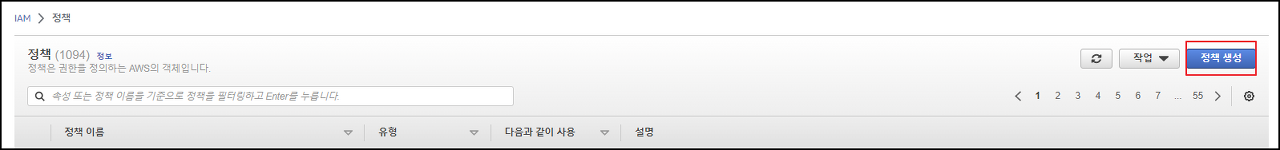 IAM -> 정책 -> 정책생성에서 정책편집기 JSON을 선택하여 정책 내용(Access-Policy.txt)을 붙여넣은 후 정책을 생성해줍니다.
