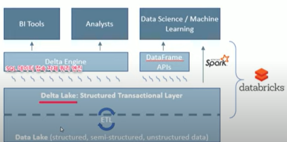 apache spark 를 기반으로 구동되는 데이터 플랫폼입니다. 여러 CSP의 데이터를 모아 정형/비정형/반정형의 데이터가 모두 모인 데이터 레이크를 구성하고, 구조화된 데이터로 구성된 델타 레이크를 제공합니다. 이때 델타엔진(Delta engine)을 통해 델다 레이크의 데이터를 시각화와 데이터 분석에 이용됩니다. DataFrame APIs를 통해 데이터 레이크의 데이터를 머신러닝과 데이터 사이언스에 데이터를 활용하게 됩니다.