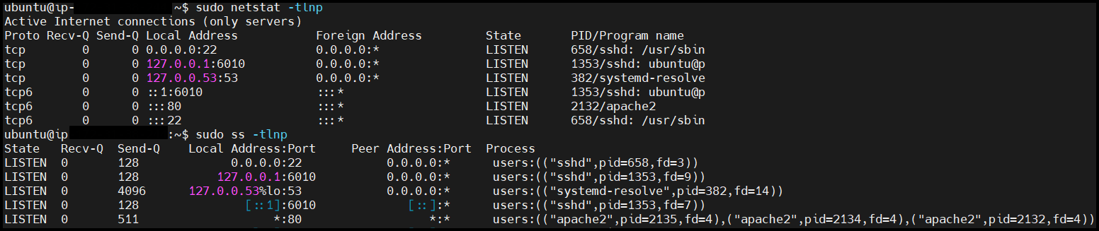 리눅스에서는 netstat 명령어나 ss 명령어를 사용하여 시스템에서 사용 중인 포트를 확인할 수 있습니다.