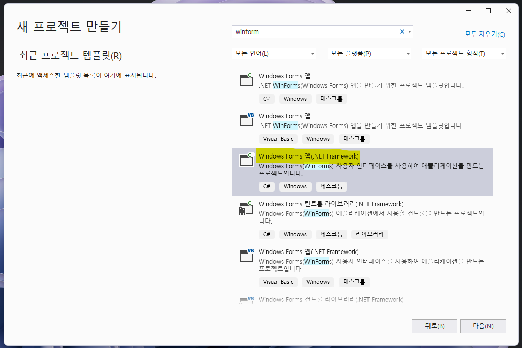 그 후 winform을 검색하면 위와 같이 Windows Forms 앱 (.NET Framework)가 보일껍니다! 해당 프로젝트를 클릭하고 다음!