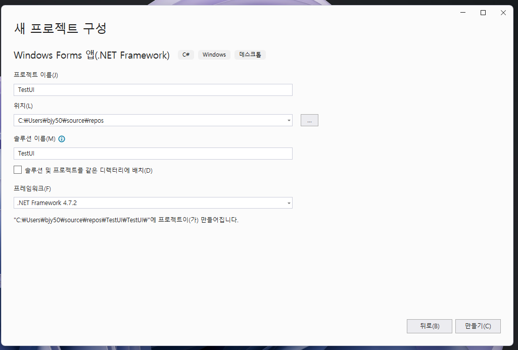저는 기본적인 default 저장 폴더에 TestUI 라는 이름으로 생성하겠습니다!