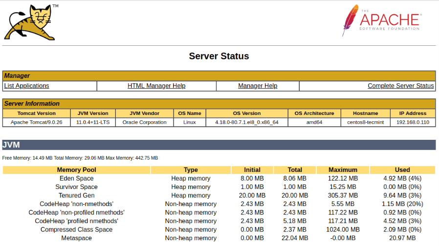 서버가 방화벽에 의해 보호되고 로컬 네트워크 외부에서 Tomcat 인터페이스에 액세스하려면 포트 8080을 열어야 합니다.