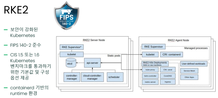 그리고 가장 주요한 보안을 빼놓을 수 없겠죠, RKE2버전에서는 1버전보다 보안 기능을 강화하여 FIPS 140-2, CIS1.5, 1.6 쿠버네티스 벤치마크를 통과하기 위한 구성 옵션을 제공하여 사용자가 쉽게 안전한 쿠버네티스 환경을 구축할 수 있도록 제공합니다.