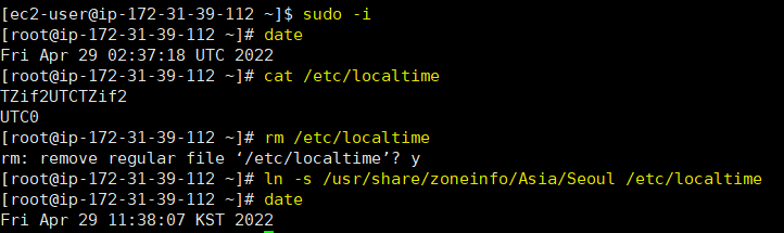 ln -s /usr/share/zoneinfo/Asia/Seoul /etc/localtime