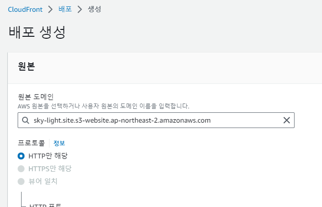 2.Origin domain에 위에서 복사한 bucket website endpoint를 붙여넣습니다