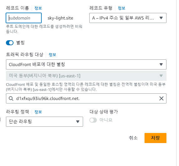 CloudFront와 Route53을 연결하기 위해서는 CloudFront의 대체 도매인이 필수로 필요합니다!(Route53이랑 같게 해주세요)