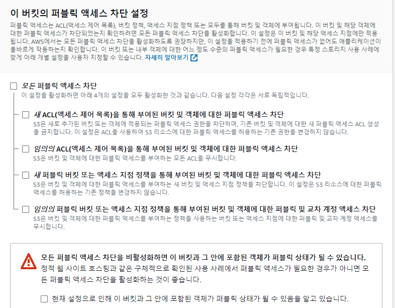 3.Block all public access를 모두 풀어줍니다