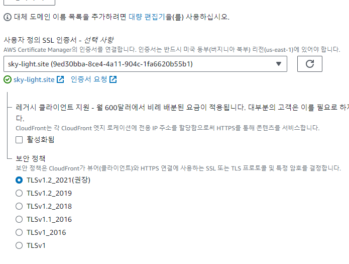 3. ACM 에서 발급 받은 인증서를 설정해 줍니다.