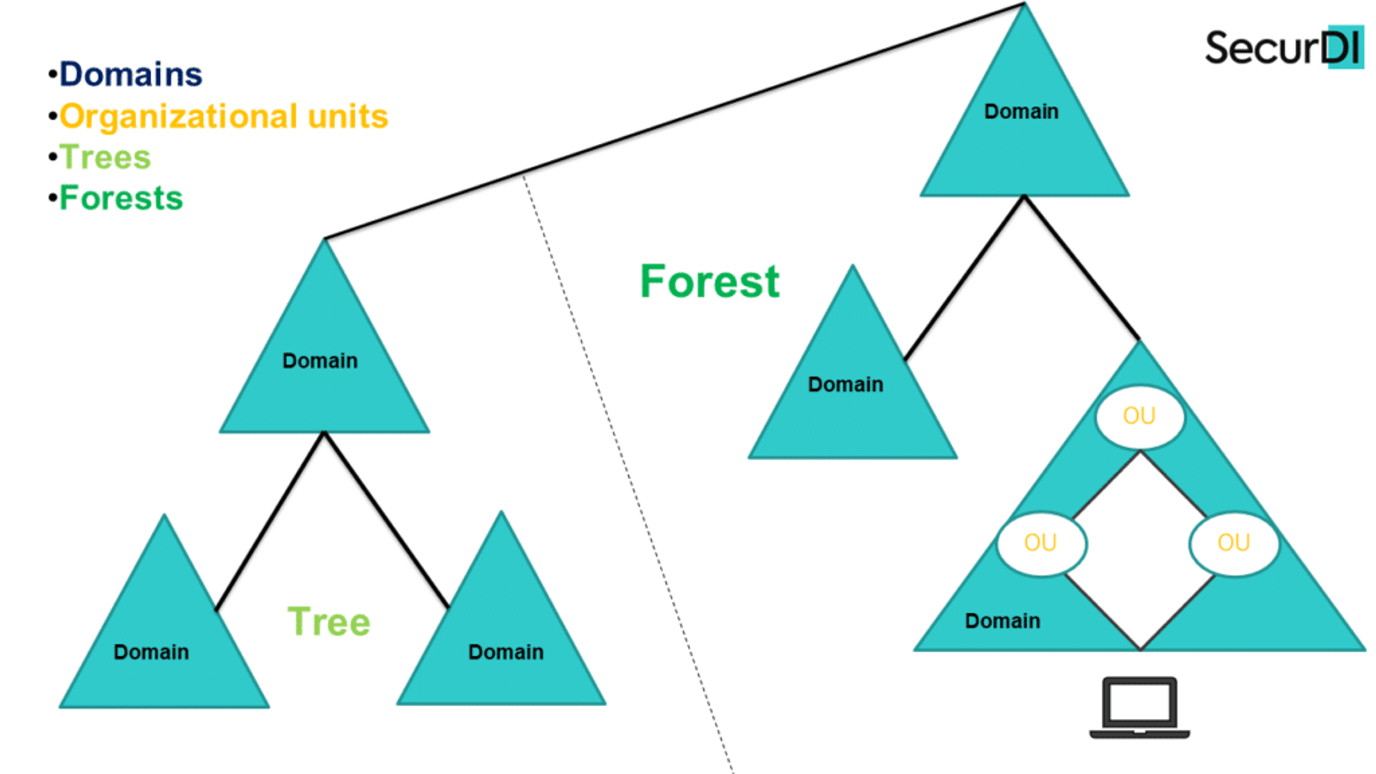 Active Directory의 구조는 아래와 같이 크게 Domain, Trees, Forests로 구성 되어 있습니다