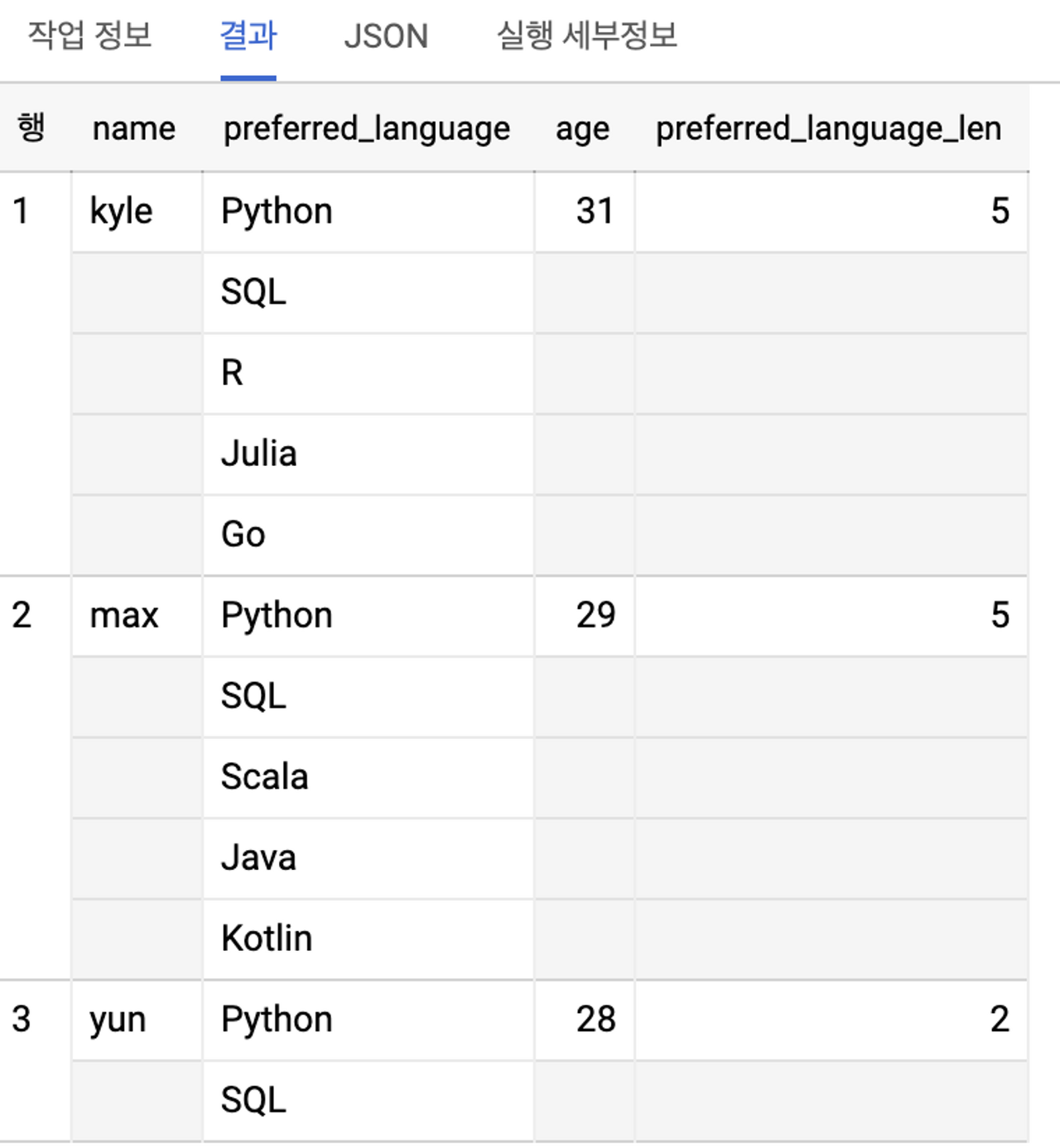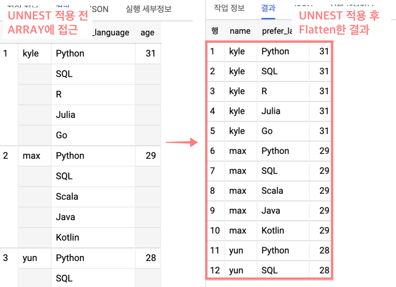 - 동일하게 적용되어 있던 컬럼이 UNNEST를 사용해 평면화 된 모습입니다.