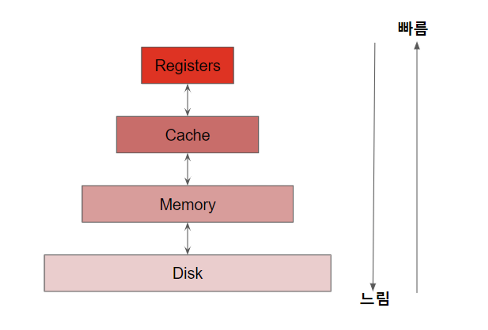 위 그림과 같이 Disk부터 Registers까지 데이터가 흘러간다고 먼저 이해하면 좋습니다. 또한 registers로 갈수록 속도가 더 빨라지는 구조입니다.