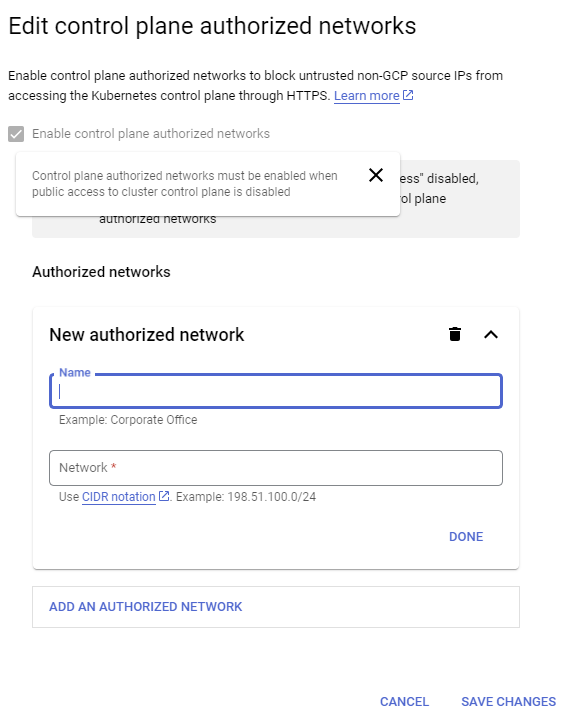 해당 클러스터에 Control plane authorized networks를 등록을 하기 위해 VM을 생성하여 등록 괜찮고 원래 있던 VM IP를 등록하시면 됩니다.