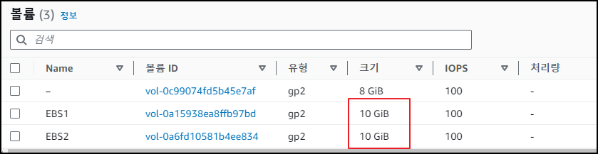 우선 10GiB 짜리 EBS 볼륨 2개를 준비합니다.