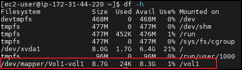 sudo mkfs -t ext4 /dev/Vol1/vol1