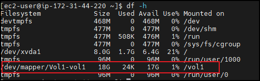 Vol1 디렉토리에 마운트 된 스토리지 크기가 18G로 늘어난 것을 확인 할 수 있습니다.