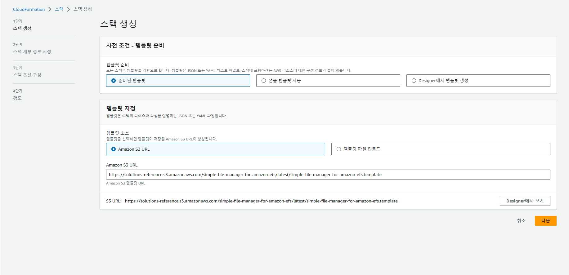 AWS 콘솔에서 로그인 후 CloudFormation의 스택 생성으로 바로 연결되요.