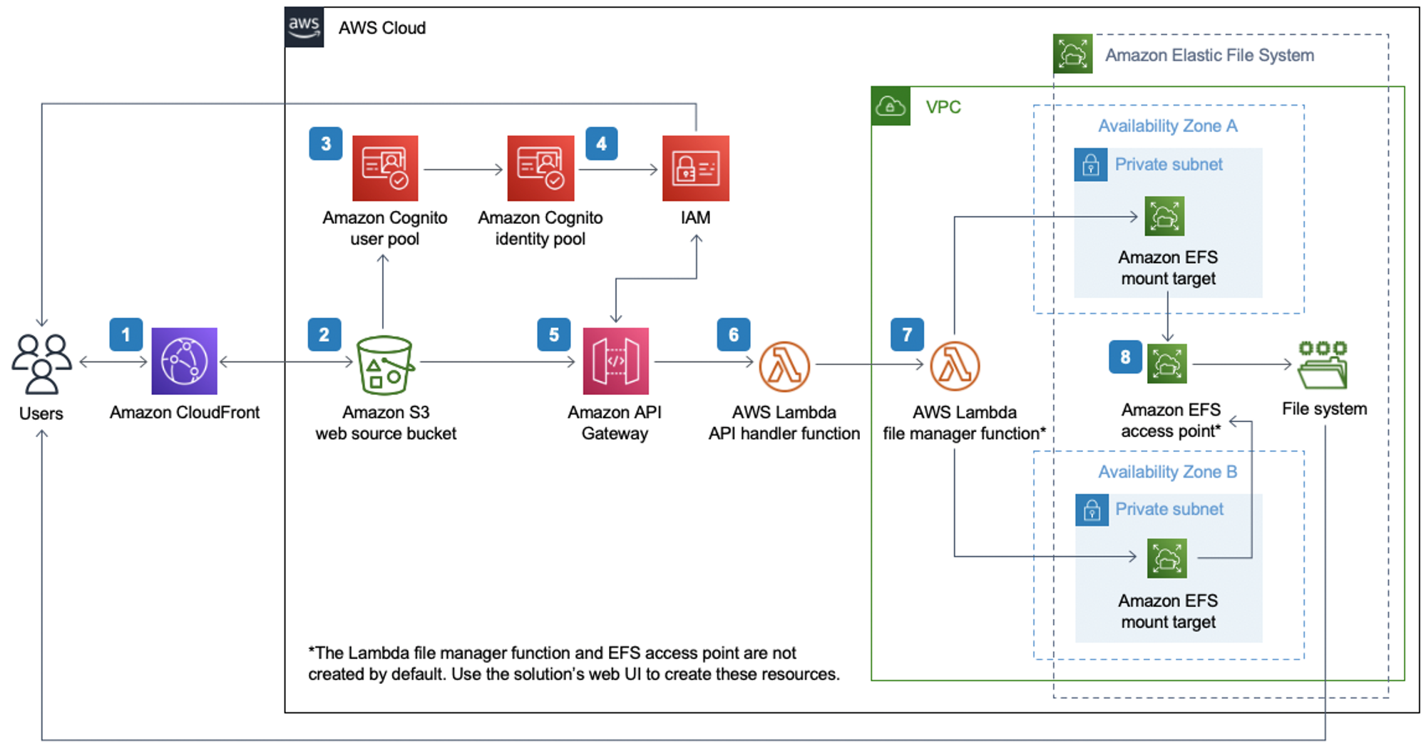 참고: AWS Lambda 파일 관리자 기능(7)과 Amazon EFS 액세스 포인트(8)는 이 솔루션의 CloudFormation 템플릿에 의해 자동으로 배포되지 않습니다. 배포 후 솔루션의 웹 UI를 사용하여 이러한 리소스를 생성하세요.