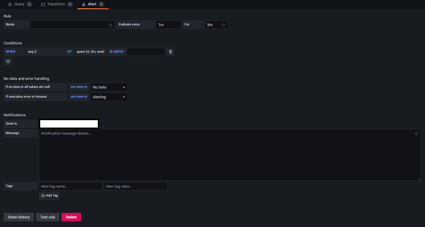 query(A, 5m, now) : 첫번째 인자는 Query 탭에서 설정한 Query의 이름입니다. 2,3 번째 인자는 시간 범위를 나타내며 5m, now 인경우 현재시간부터 5분 전까지의 데이터를 탐색합니다.