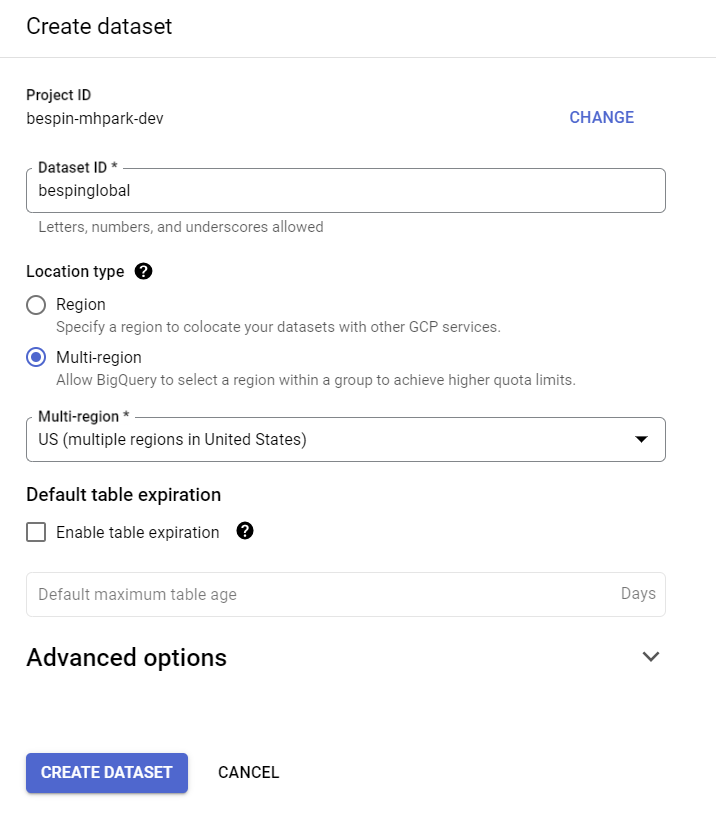 - Location type 에 대해 데이터 세트의 지리적 위치를 선택하며 데이터 세트가 생성된 후에는 위치를 변경할 수 없습니다.