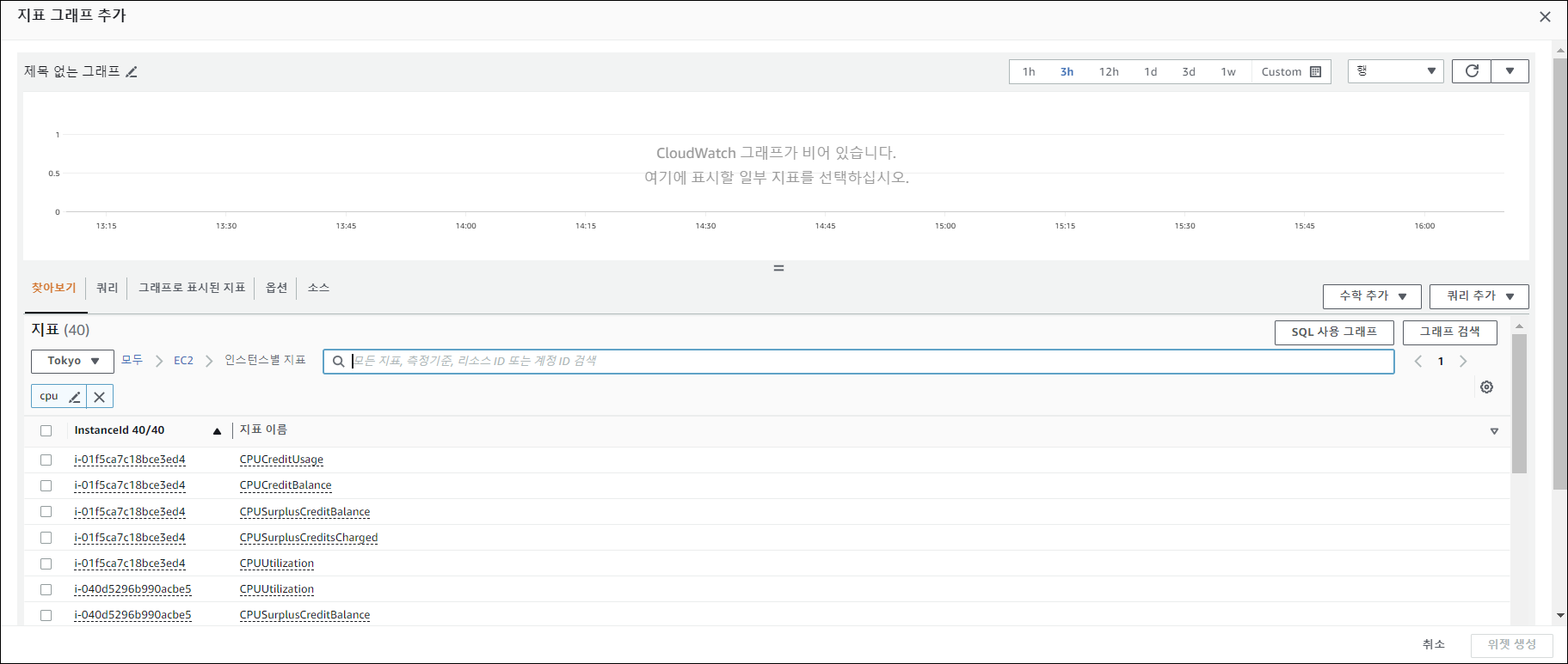 2-3. 그리고 지표를 다음과 같이 검색하여 추가한후 위젯을 생성합니다. - CPU: CPUUtilization