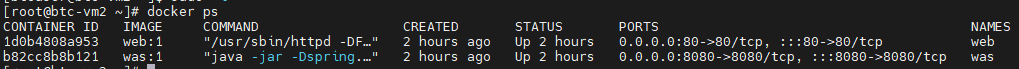 이렇게까지 하고나면 web, was 두 개의 컨테이너가 올라간 모습을 볼 수 있습니다!
