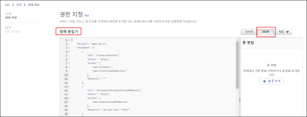 IAM 사용자에 MFA를 강제하는 설정은 json 정책으로 생성하여야 합니다.