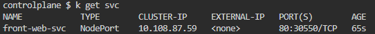 front-web 이름의 디플로이먼트(Deployment)를 NodePort 타입의 서비스로 노출하며,